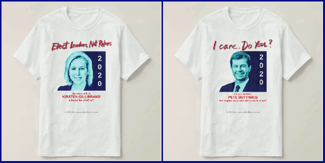 We’ve created a line of designs for each of the 2020 presidential hopefuls. We are presenting them to the candidates. These designs bear the following text: